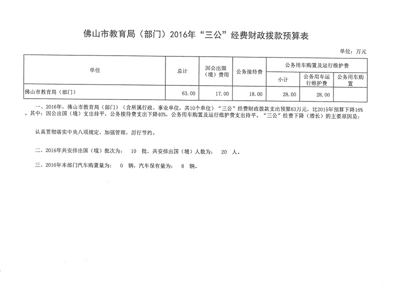 2016年 “三公”经费财政拨款预算合计63万元。其中:因公出国(境)经费预算17万元,占26.98%;公务用车购置及运行费预算28万元(包括:公务用车购置费0万元、公务用车运行费28万元),占44.45%;公务接待费预算18万元,占28.57%。