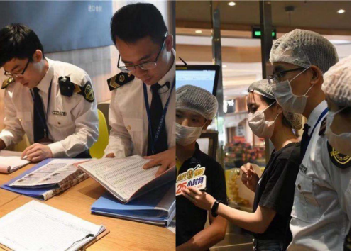 第一站由食品安全管理员带路,执法队员深入到海底捞的粗加工间、洗消间、备餐间、小吃间和凉菜间等多个处理间,对食品、加工设备、工用具和环境等进行抽查,查看了海底捞的安全自查记录、员工健康证信息和各种索票索证资料。经检查,管理总体情况良好,符合食品安全等级A级的要求,但仍有待改进的地方,如处理食材的砧板要立起放置,避免滋生细菌;厨房存在水渍残留的现象,需要加强完善。