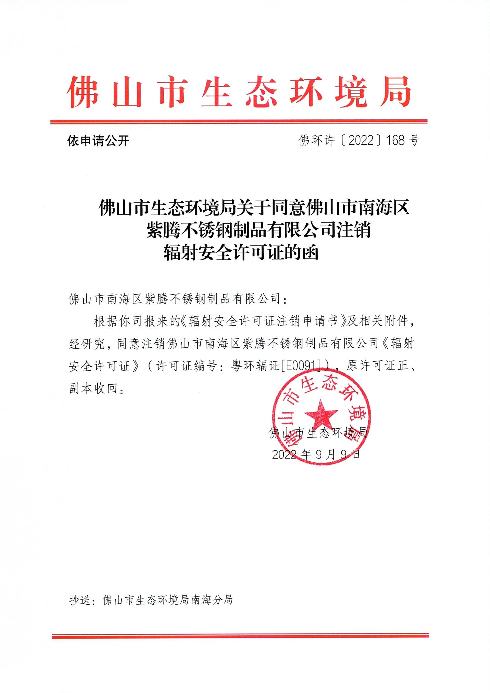附件下载:佛环许〔2022〕168号365怎么查看投注记录_365bet娱乐注册_365bet不能注册生态环境局关于同意365怎么查看投注记录_365bet娱乐注册_365bet不能注册南海区紫腾不锈钢制品有限公司注销辐射安全许可证的函.jpg