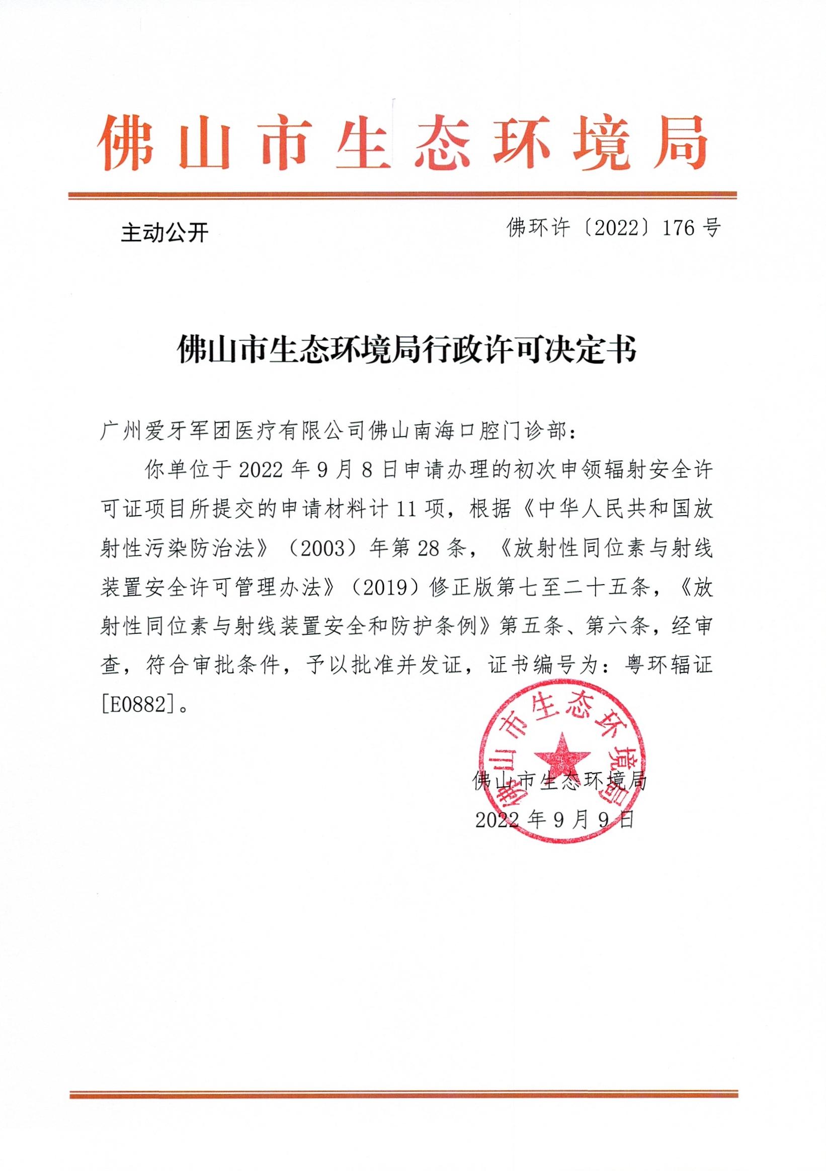附件下载:佛环许〔2022〕176号广州爱牙军团医疗有限公司佛山南海口腔门诊部.jpg