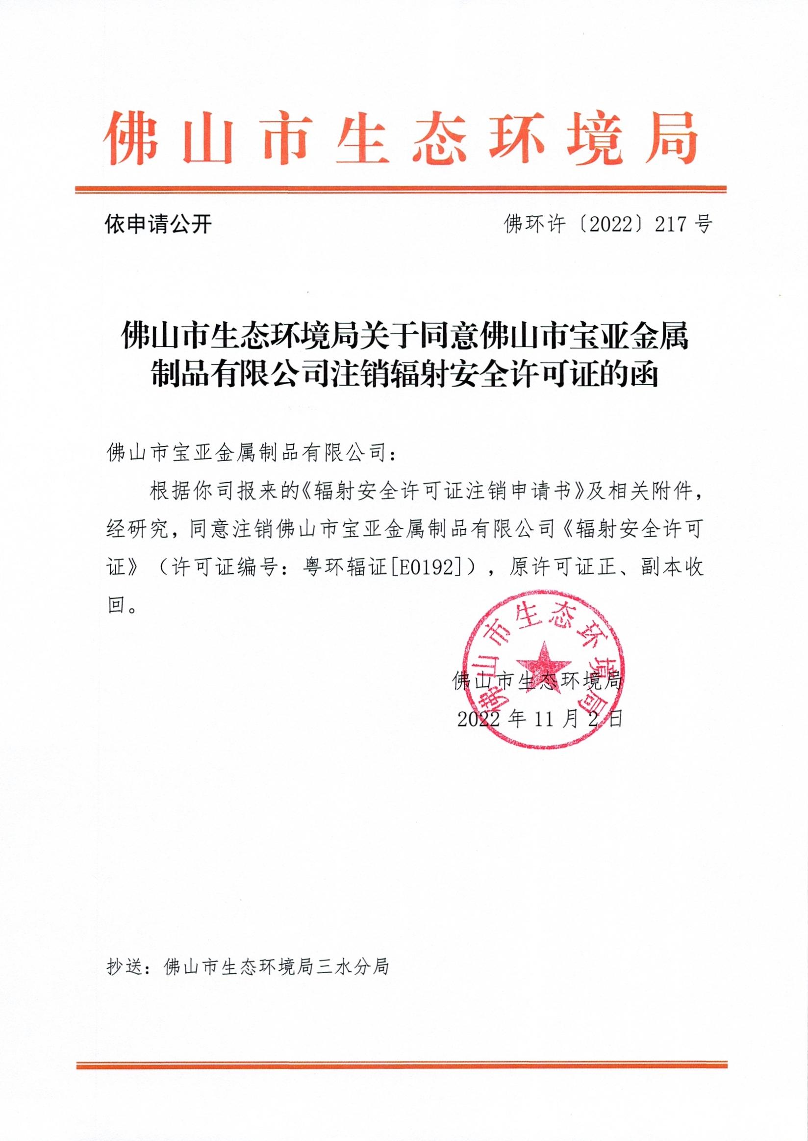 附件下载:佛环许〔2022〕217号365怎么查看投注记录_365bet娱乐注册_365bet不能注册生态环境局关于同意365怎么查看投注记录_365bet娱乐注册_365bet不能注册宝亚金属制品有限公司注销辐射安全许可证的函.jpg