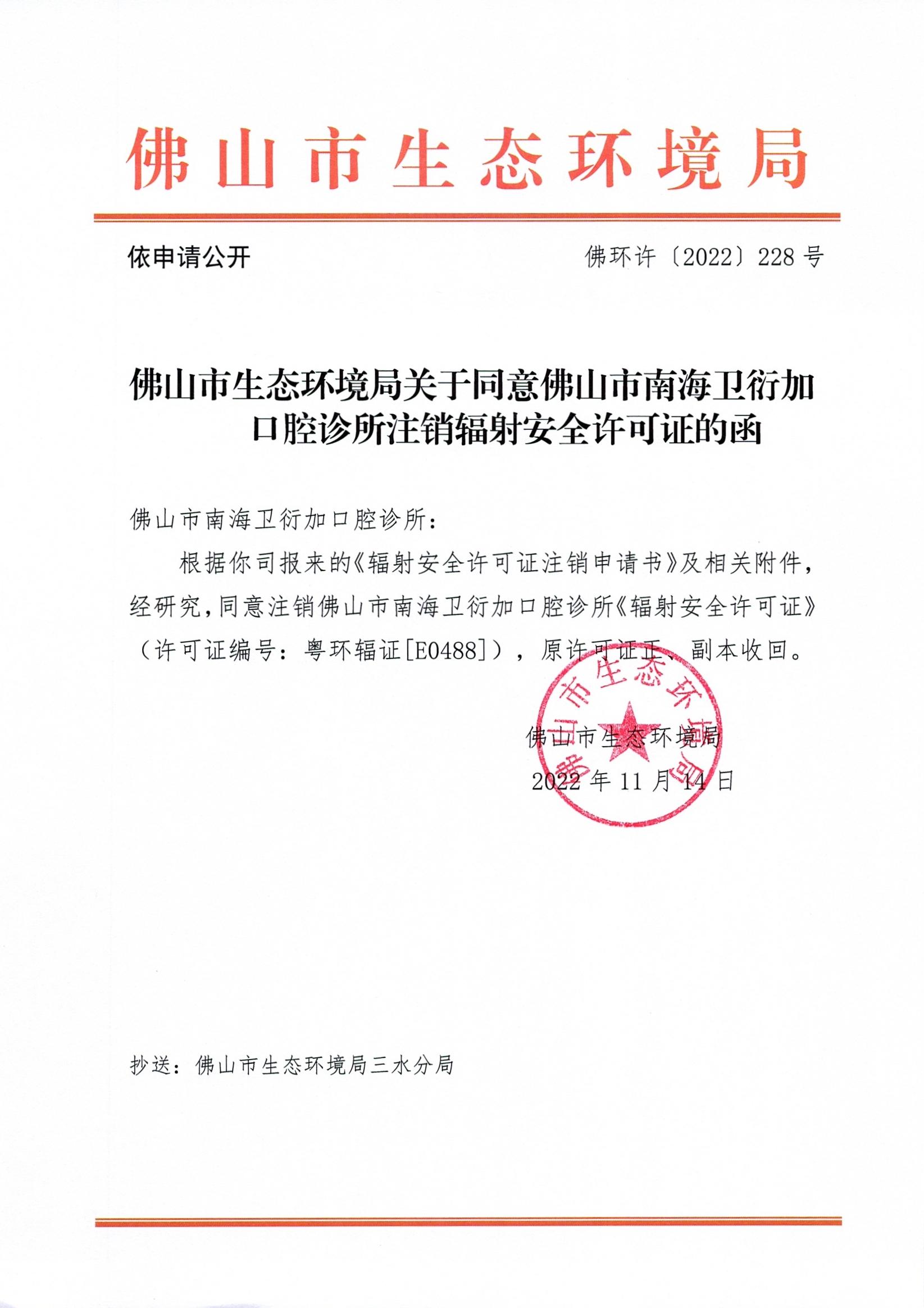 附件下载:佛环许〔2022〕228号365怎么查看投注记录_365bet娱乐注册_365bet不能注册生态环境局关于同意365怎么查看投注记录_365bet娱乐注册_365bet不能注册南海卫衍加口腔诊所注销辐射安全许可证的函.jpg