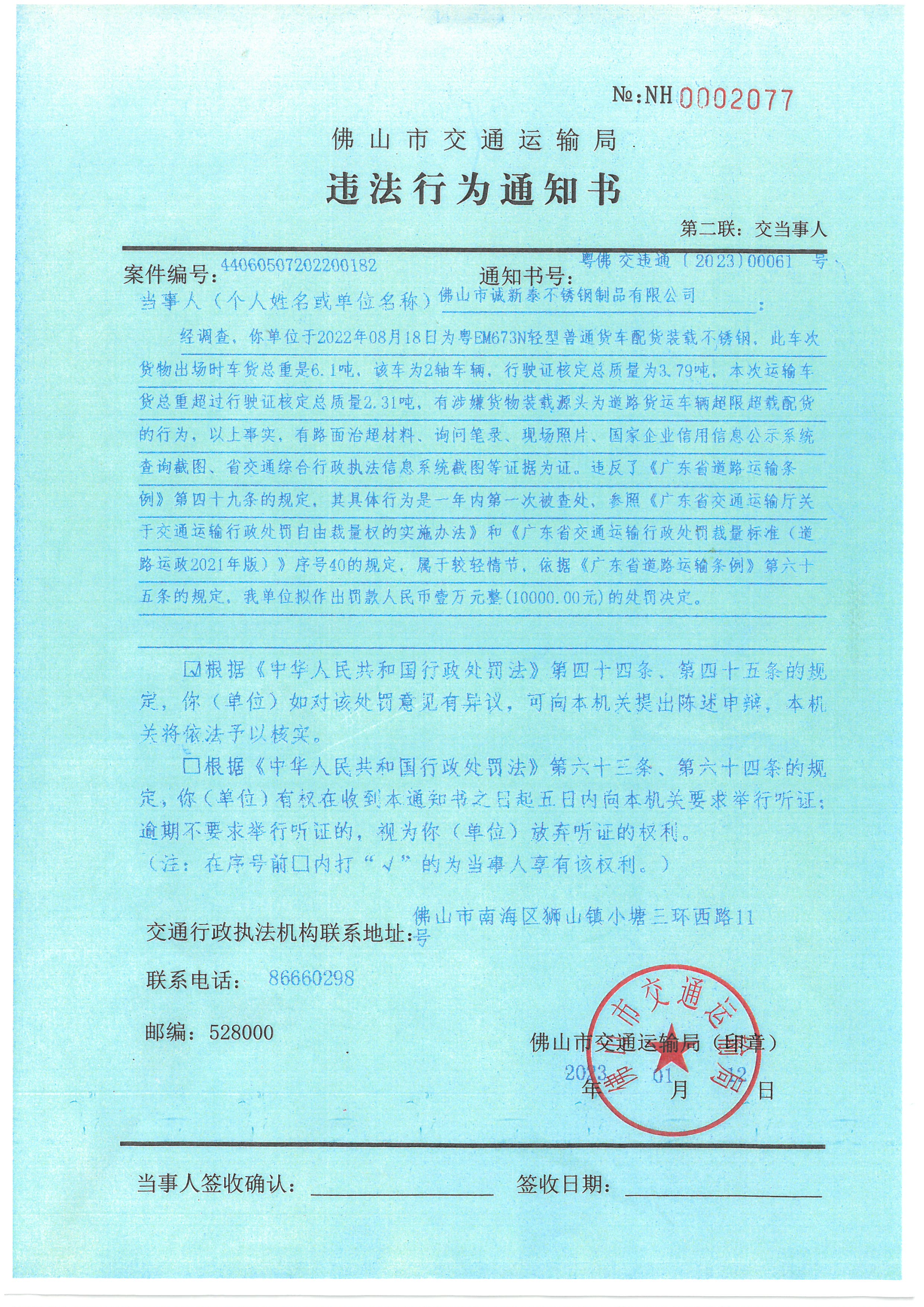 365怎么查看投注记录_365bet娱乐注册_365bet不能注册诚新泰不锈钢制品有限公司: 因通过其它方式均无法送达《违法行为通知书》,依据《中华人民共和国民事诉讼法》第九十五条规定,现向你(单位)公告送达《违法行为通知书》,《违法行为通知书》文号:粤佛交违通[2023]00061号。自公告之日起,经过三十日即视为送达。违法行为通知书内容如下: 经调查,本机关认为你单位使用粤EM673N轻型普通货车于2022年08月18日有涉嫌货物装载源头为道路货运车辆超限超载配货的违法行为,以上事实,有路面治超材料、询问笔录、现场照片、国家企业信用信息公示系统查询截图、省交通综合行政执法信息系统截图等证据为证。违反了《广东省道路运输条例》第四十九条的规定,其具体行为是一年内第一次被查处,参照《广东省交通运输厅关于交通运输行政处罚自由裁量权的实施办法》和《广东省交通运输行政处罚裁量标准(道路运政2021年版)》序号40的规定,属于较轻情节,依据《广东省道路运输条例》第六十五条的规定,本机关拟作出罚款人民币壹万元整(10000.00元)的处罚决定。 根据《中华人民共和国行政处罚法》第四十四条、第四十五条的规定,你(单位)如对该处罚意见有异议,可向本机关提出陈述申辩,本机关将依法予以核实。 上述文书已张贴在我局南海综合执法支队(执法七大队)的办公地址(365怎么查看投注记录_365bet娱乐注册_365bet不能注册南海区狮山镇小塘三环西路11号)门口公告栏,现在365怎么查看投注记录_365bet娱乐注册_365bet不能注册交通运输局网站上同时发布公告信息。 附件:《违法行为通知书》(365怎么查看投注记录_365bet娱乐注册_365bet不能注册诚新泰不锈钢制品有限公司,粤佛交违通[2023]00061号).jpg