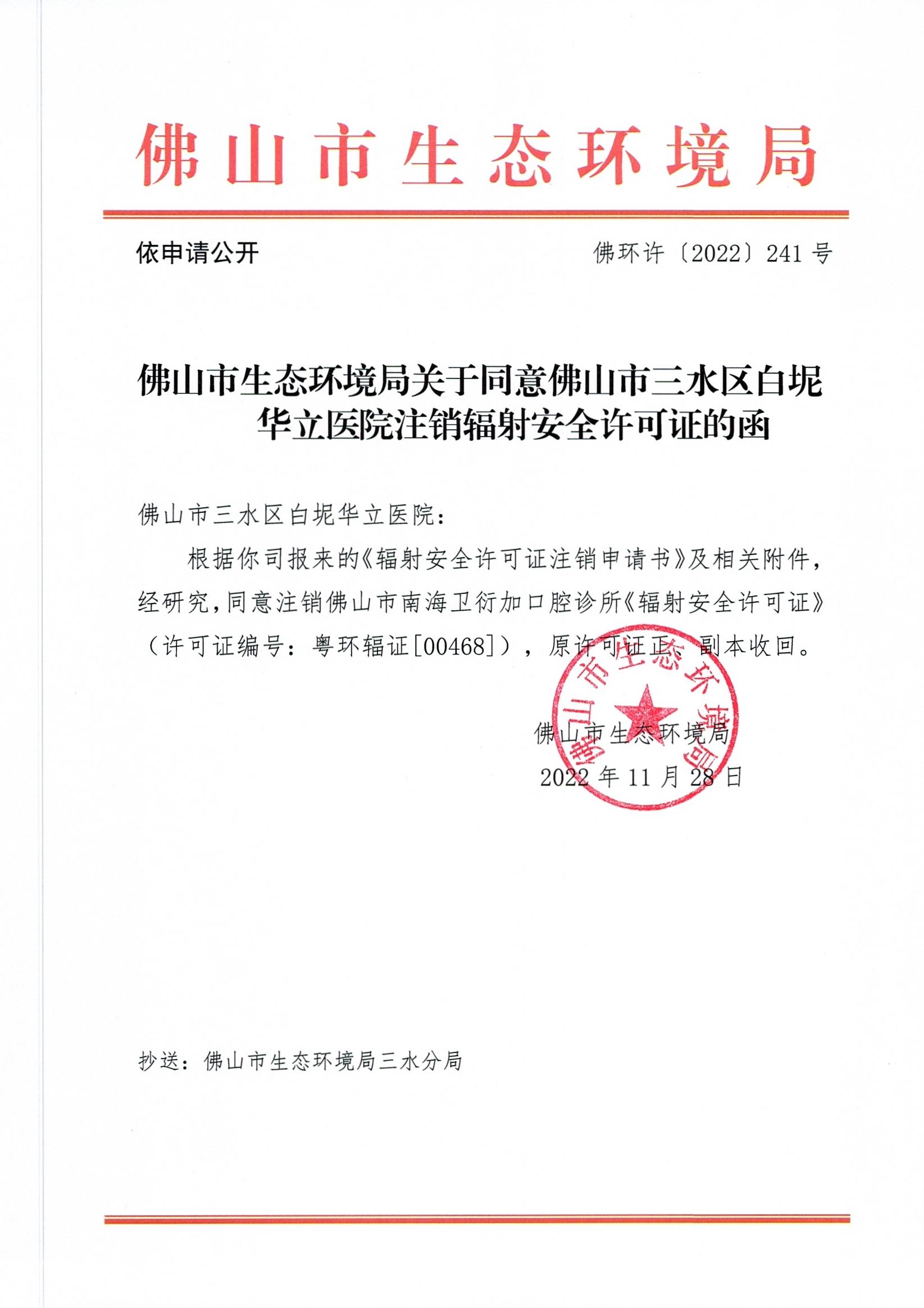 附件下载:佛环许〔2022〕241号365怎么查看投注记录_365bet娱乐注册_365bet不能注册生态环境局关于同意365怎么查看投注记录_365bet娱乐注册_365bet不能注册三水区白坭华立医院注销辐射安全许可证的函.jpg