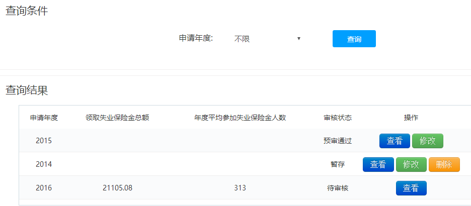 功能描述:对企业所有年度的稳岗补贴申报信息列表化进行管理