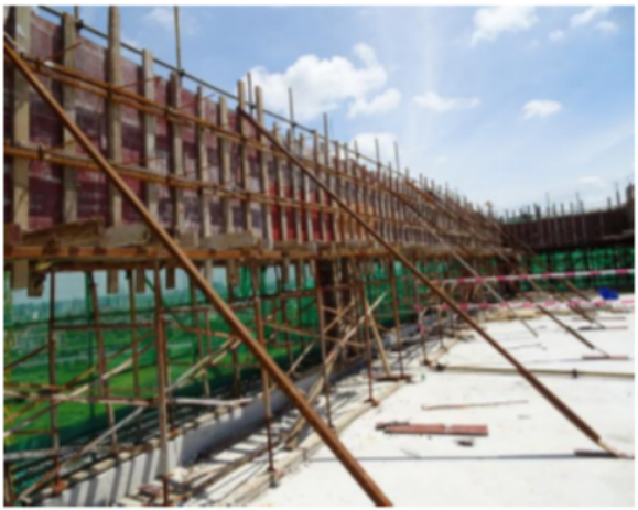 当外排斜立杆失稳,偏心力矩由侧向拉(撑)杆承受,并对其产生拉力,对侧向拉(撑)杆进行受力验算,按杆件间距按2.0m,梁混凝土按实际施工完成0.6m高进行计算,验算结果,斜杆受到的拉力为2.87kN(约为287千克力),现有拉(撑)杆仅使用几根铁钉和木板与钢管连接(见图4.4,图4.5),连接处明显不牢固,不可靠,不可能承受2.87kN的拉力,该斜向拉(撑)杆不起作用,不能起到防止梁模板侧倾的作用。